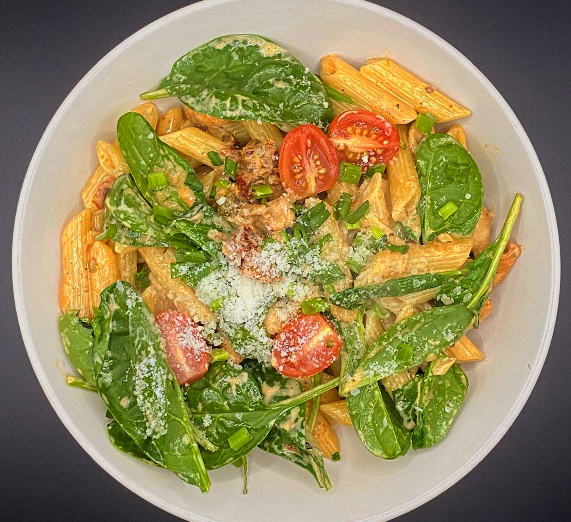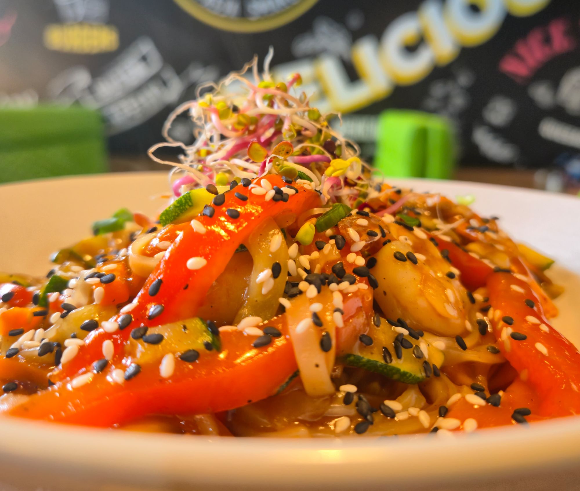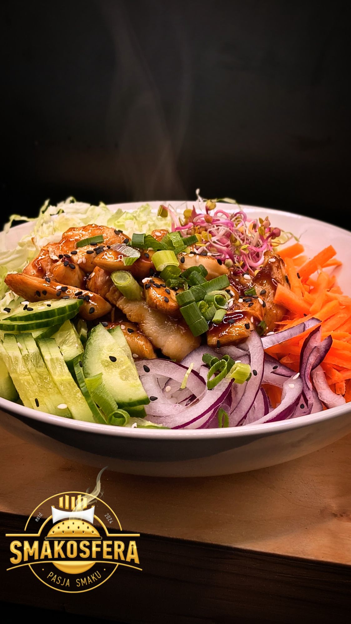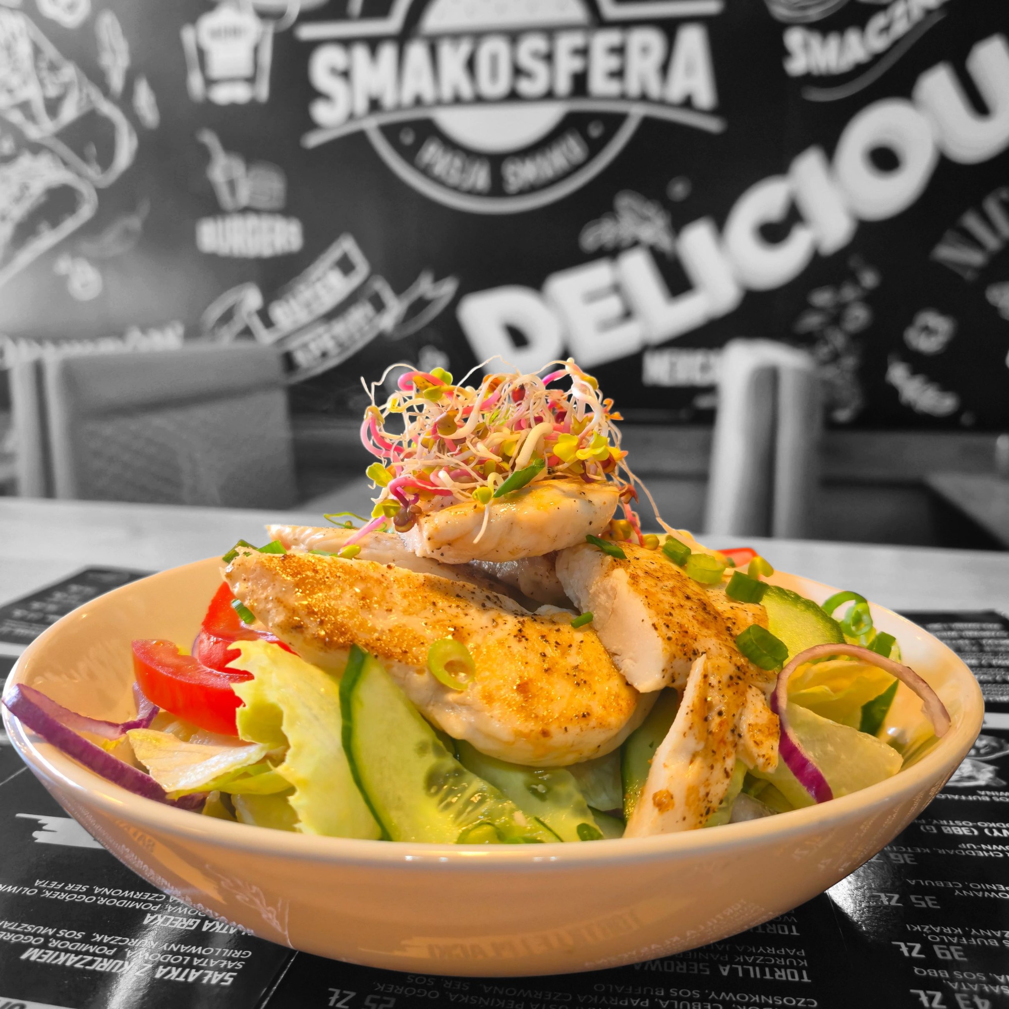 ser mozzarella, grillowany kurczak, papryka czerwona, kukurydza, cebula prażona