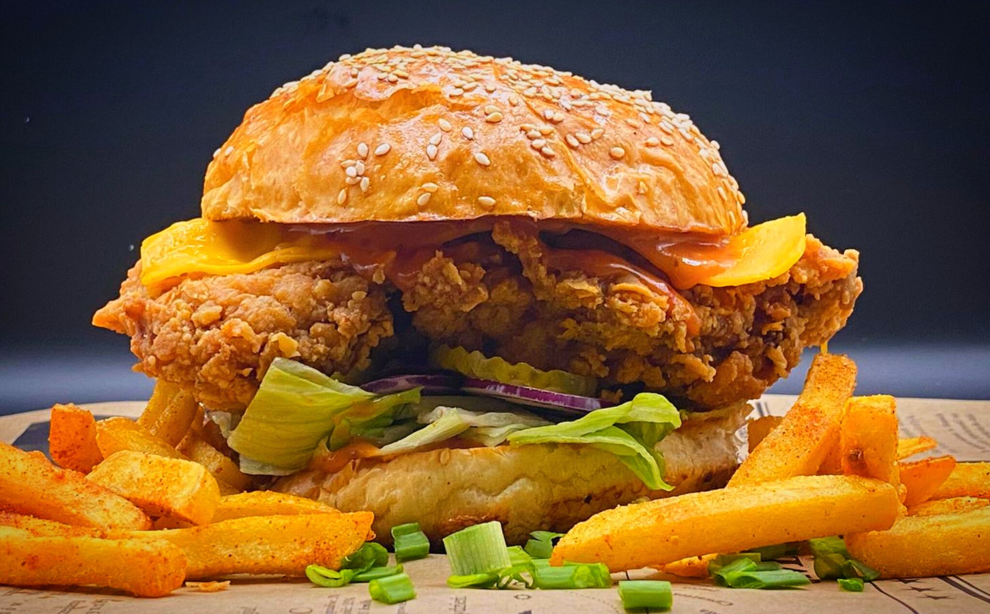 kurczak panierowany, ser mozzarella, ser cheddar, papryka jalapenio, pikle -