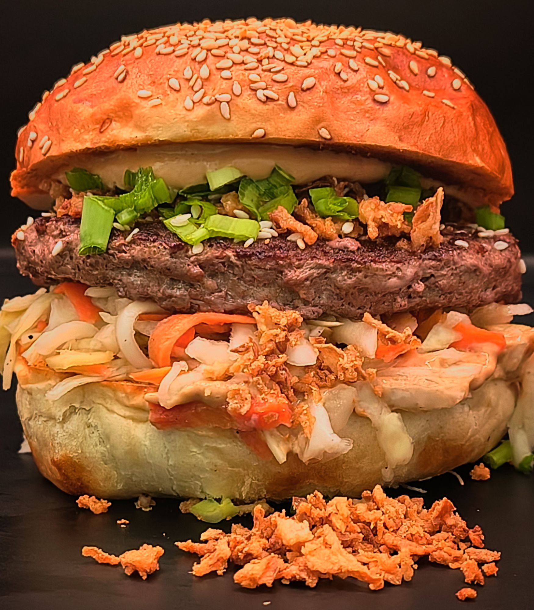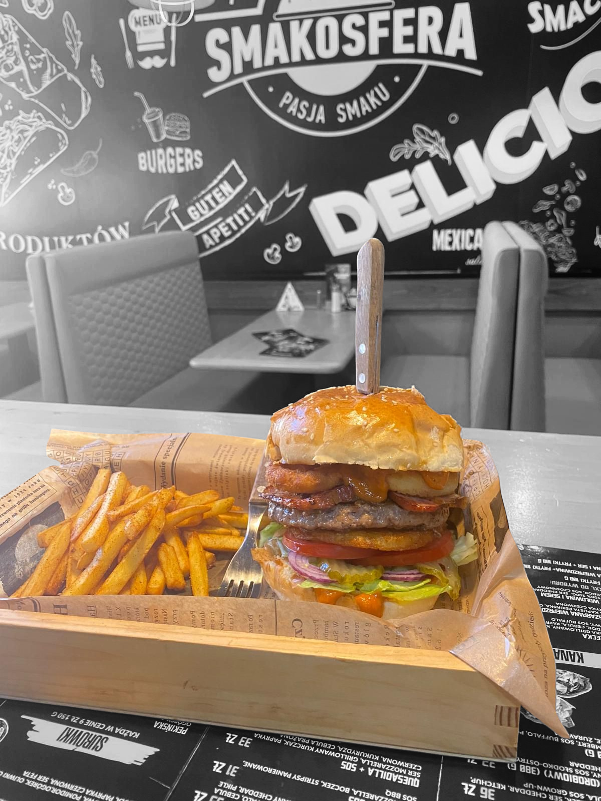 wołowina 100% 200g, boczek, góralski ser, sałata, cebula, pomidor, kiszony ogórek, żurawina, sos BBQ