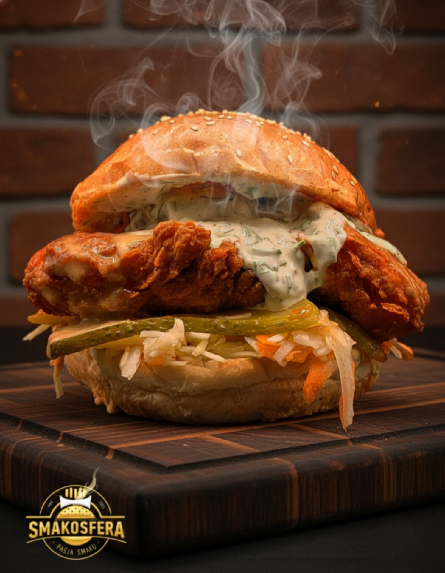 • Soczysta kanapka z kurczakiem, sałatą, ogórkiem kiszonym i aromatycznym sosem, błyskawice pary unoszące się w powietrzu.