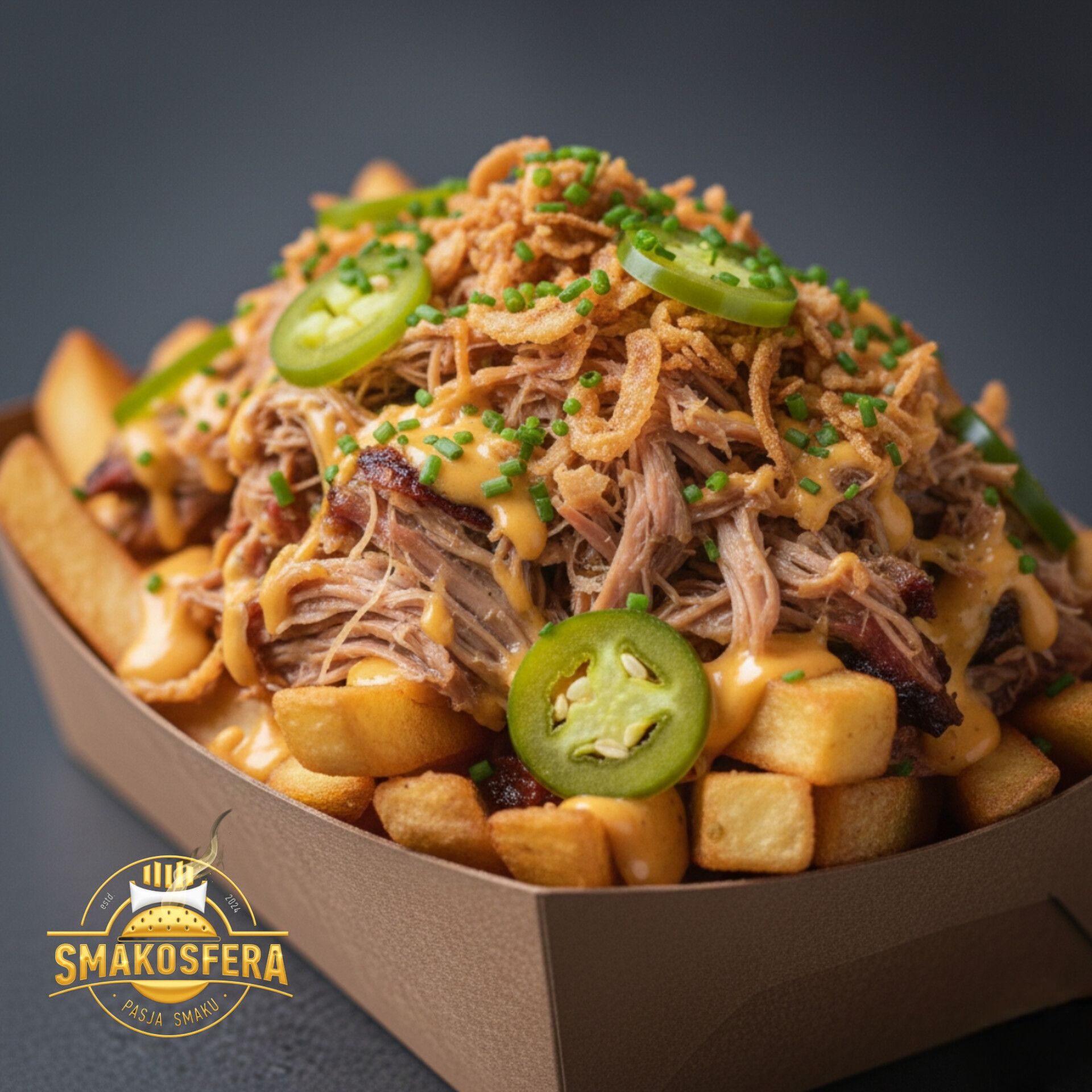 200g Frytek | szarpana wieprzowina BBQ | sos serowy | pickle | jallapenio | cebula prażona | szczypiorek | polane sosem