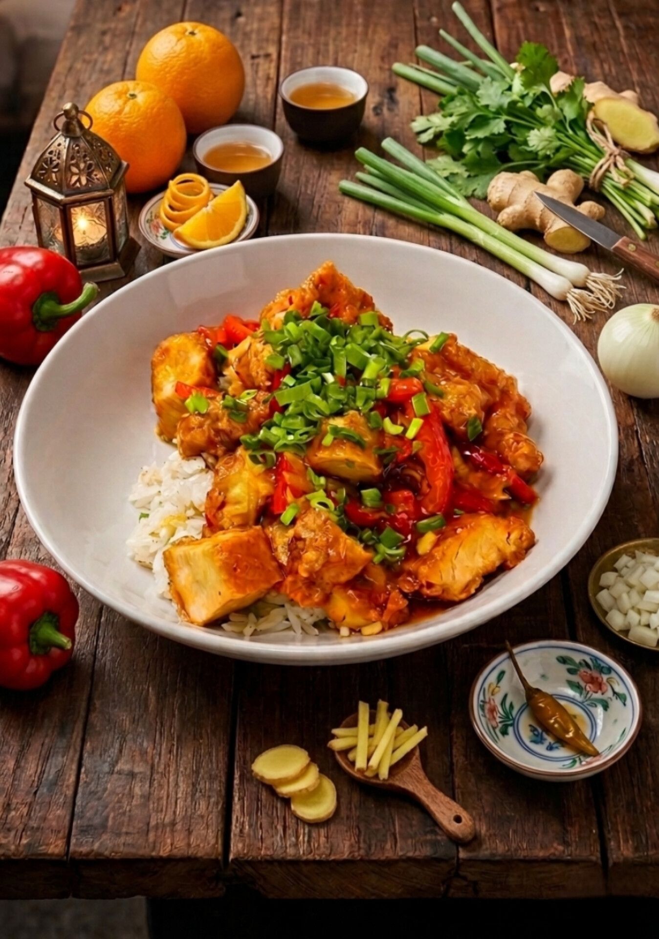 Imbir | czosnek | cebula biała | Papryka czerwona | świeży szczypiorek | ryż jaśminowy